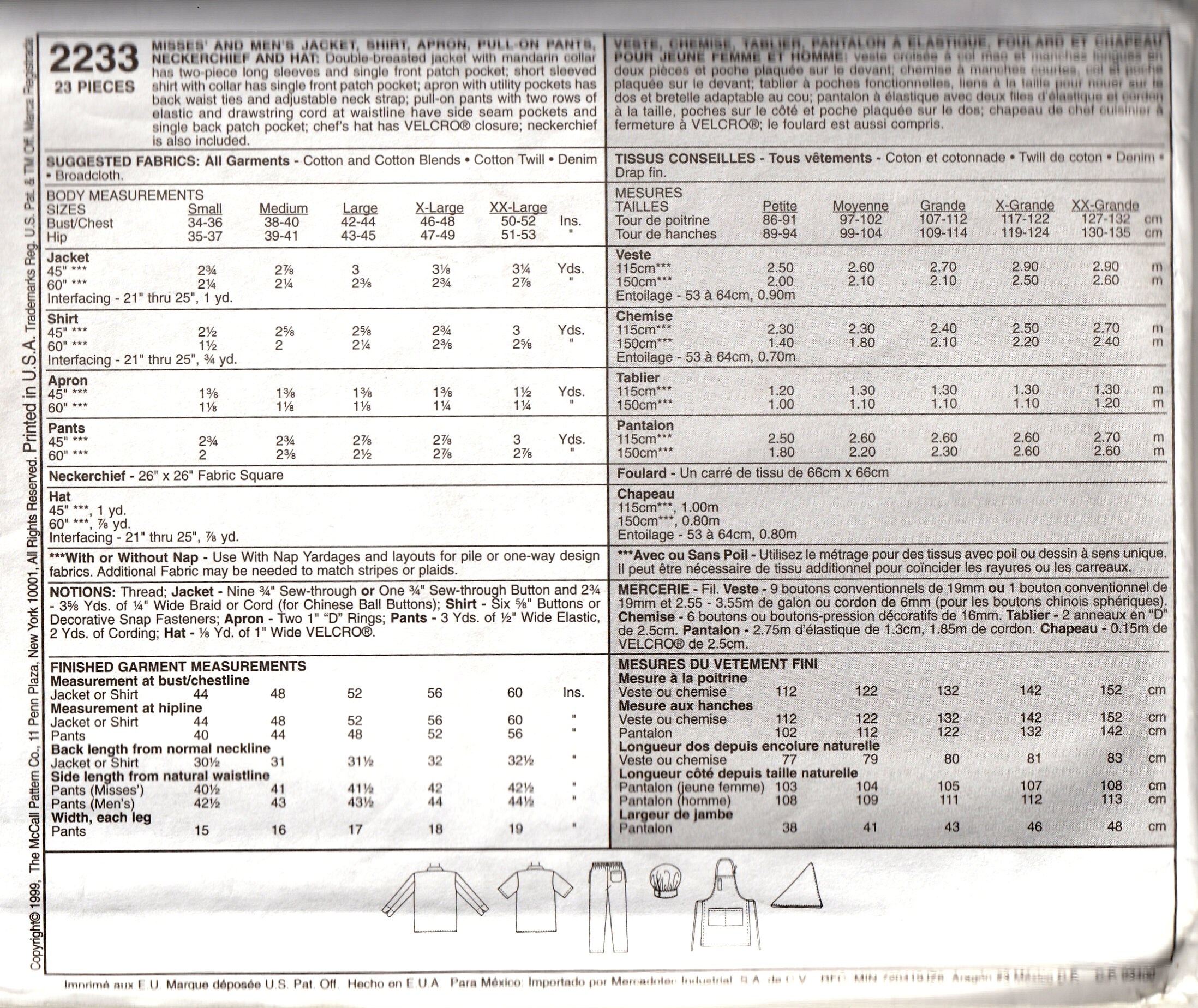 Sewing Pattern Mccalls 2233 Unisex Chef S Clothes Etsy